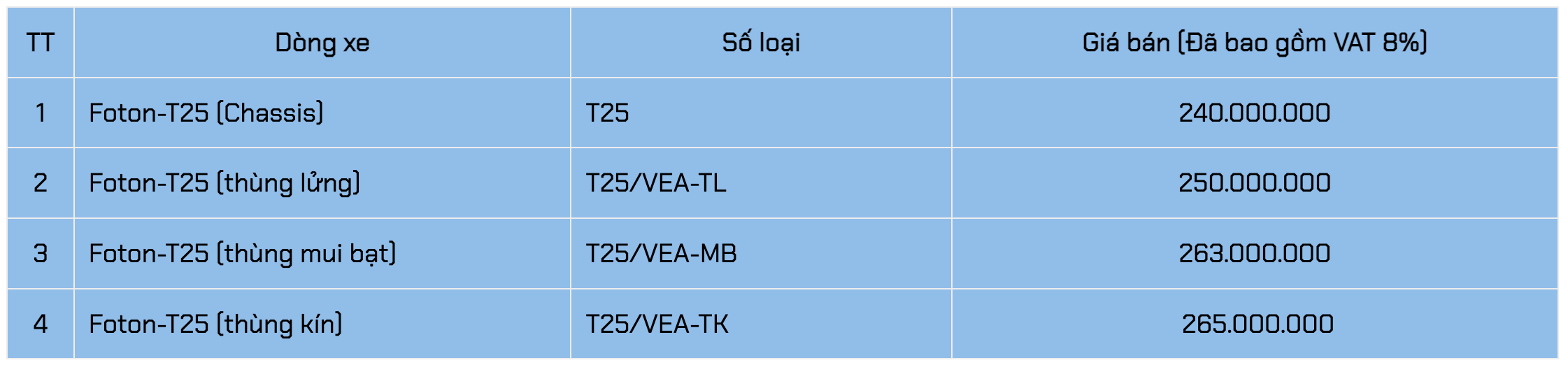 VEAM FOTON T25 là mẫu xe tải nhẹ máy xăng THẾ HỆ MỚI, được trang bị động cơ xăng DAM15 công nghệ Nhật Bản, tiêu chuẩn khí thải EURO 5, vận hành mạnh mẽ tối ưu khí động học. Thiết kế mang đậm phong cách Nhật Bản: HIỆN ĐẠI – TINH TẾ – GIẢN ĐƠN NHƯNG TRỌNG CÔNG NĂNG.